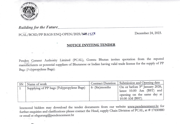Penden Cement Authority Limited (PCAL), Gomtu, Bhutan invites quotations from reputed manufacturers or potential suppliers of Bhutanese or Indian origin having a valid trade license for the supply of PP Bags (Polypropylene Bags).